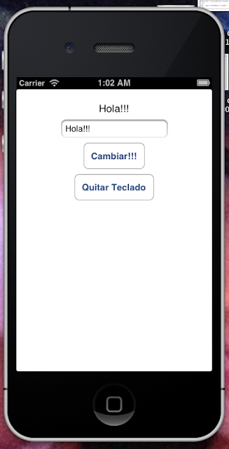 Esto nos indica que la Label tomara el valor de la caja de texto, ahora, porque declarar un botón que nos quite el teclado? Porque iOS como tal no dispone de una función que nos "quite" el teclado de la pantalla, hay que crear un botón(la mayoría de los desarrolladores crea un botón "invisible" y lo ubica atrás de todos los objetos) el cual nos quite el teclado, para hacer esto en el método quitarTeclado escribimos lo siguiente: